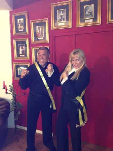 Fürstin Susanne beim Fun Boxing mir Sir Richard Bustillo, Ehrenritter zu Romkerhall. Sir Richard war der letzten noch lebenden Schüler der Kampfsport-Legende Bruce Lee und verstarb 2017. |